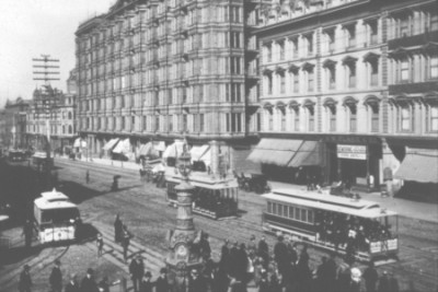 Above, Market Street at Geary in the 1880s. The imposing building (center) is the original Palace Hotel which, when it opened in 1875, was promoted as one of the finest hotels in the world. It survived with minor structural damage the early morning earthquake of April 18 1906 but was consumed by fire later that afternoon, as were all other buildings seen here. In those days cable cars were not limited to Powell Street and Fisherman's Wharf but ran along several major streets in San Francisco. Lotta's Fountain survived the quake and the fire, and today can be seen at the same location (below).